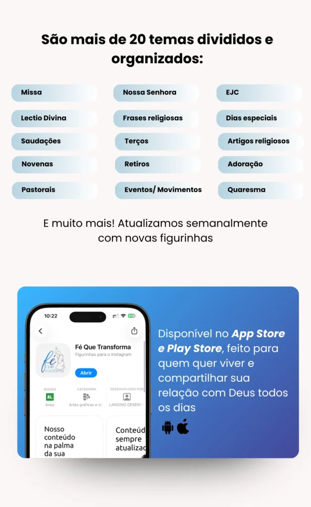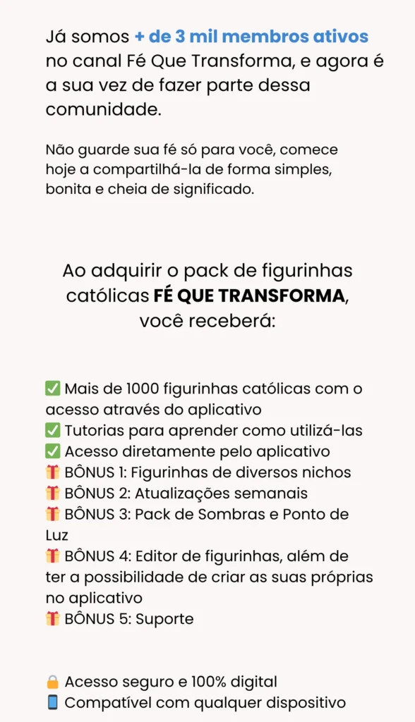 A assinatura do Fé Que Transforma oferece acesso ilimitado a todas as figurinhas, atualizações semanais, ferramentas de personalização e muito mais.